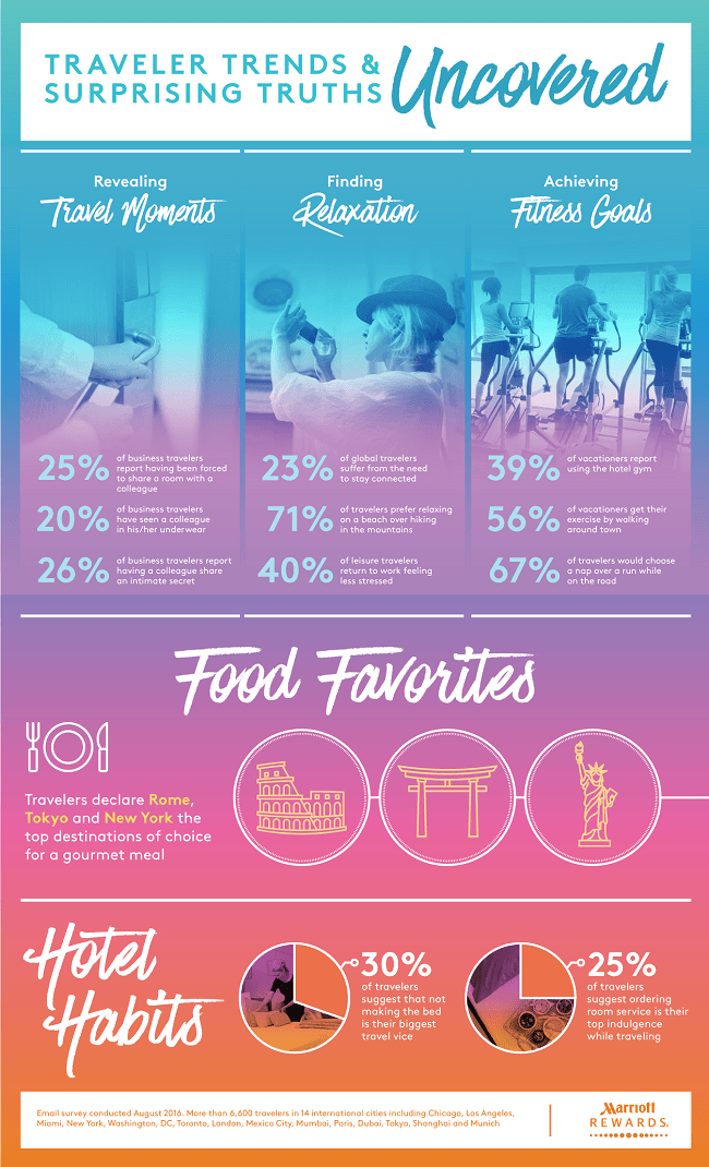 Il 30% dei viaggiatori delle 14 più importanti città al mondo dichiarano che, tra le cose che amano di più del viaggio, ci sia il non dover rifare il letto la mattina. Mentre ben il 67% degli intervistati preferisce dormire anziché fare jogging. Oppure, ancora, le donne sono quelle più efficaci quando si tratta di “staccare” completamente dal lavoro e concedersi una vera e propria vacanza disconnessa. Il 34% delle donne intervistate da Marriot si rivelano pronte a staccare completamente, mentre gli uomini in grado di farlo realmente sono soltanto il 23%. Tanti, e curiosi, i trend scoperti da Marriot, come puoi vedere in questa infografica, dal sito Travel by Marriot. Scopri i trend ed anticipa le esigenze dei tuoi ospiti.